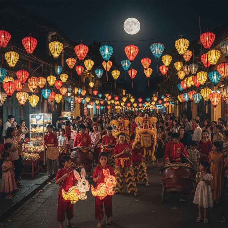 Khi trăng lên cao, trẻ em cầm đèn đi rước quanh xóm làng, tạo nên khung cảnh rộn ràng và ấm áp.