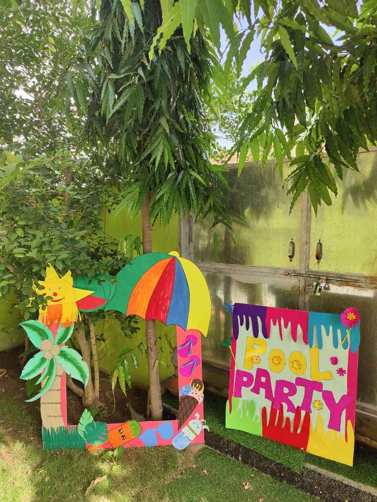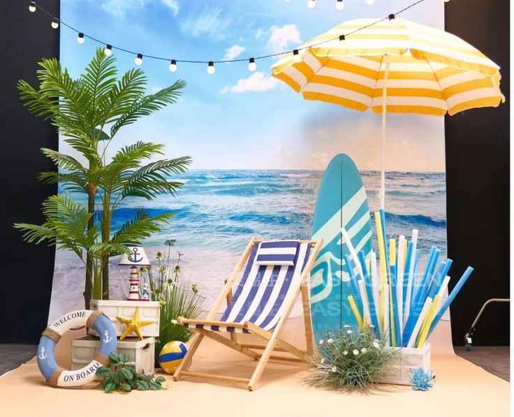 Bạn có thể thiết kế phông nền với bảng chữ, mô hình phao bơi, lá dừa hoặc phụ kiện mùa hè.